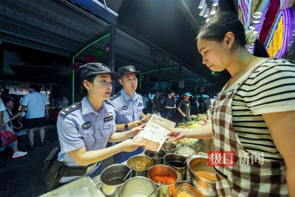 在人头攒动的户部巷夜市,中华路派出所民警雷梦丽、张峻豪、何良柱穿梭于街头,向路边商户及过路游客发放消防安全、反电信诈骗宣传单。“这里人多,宣传效果更好一些。”民警雷梦丽说,“大家不但能吃美食、赏夜景,还能顺便长知识。”