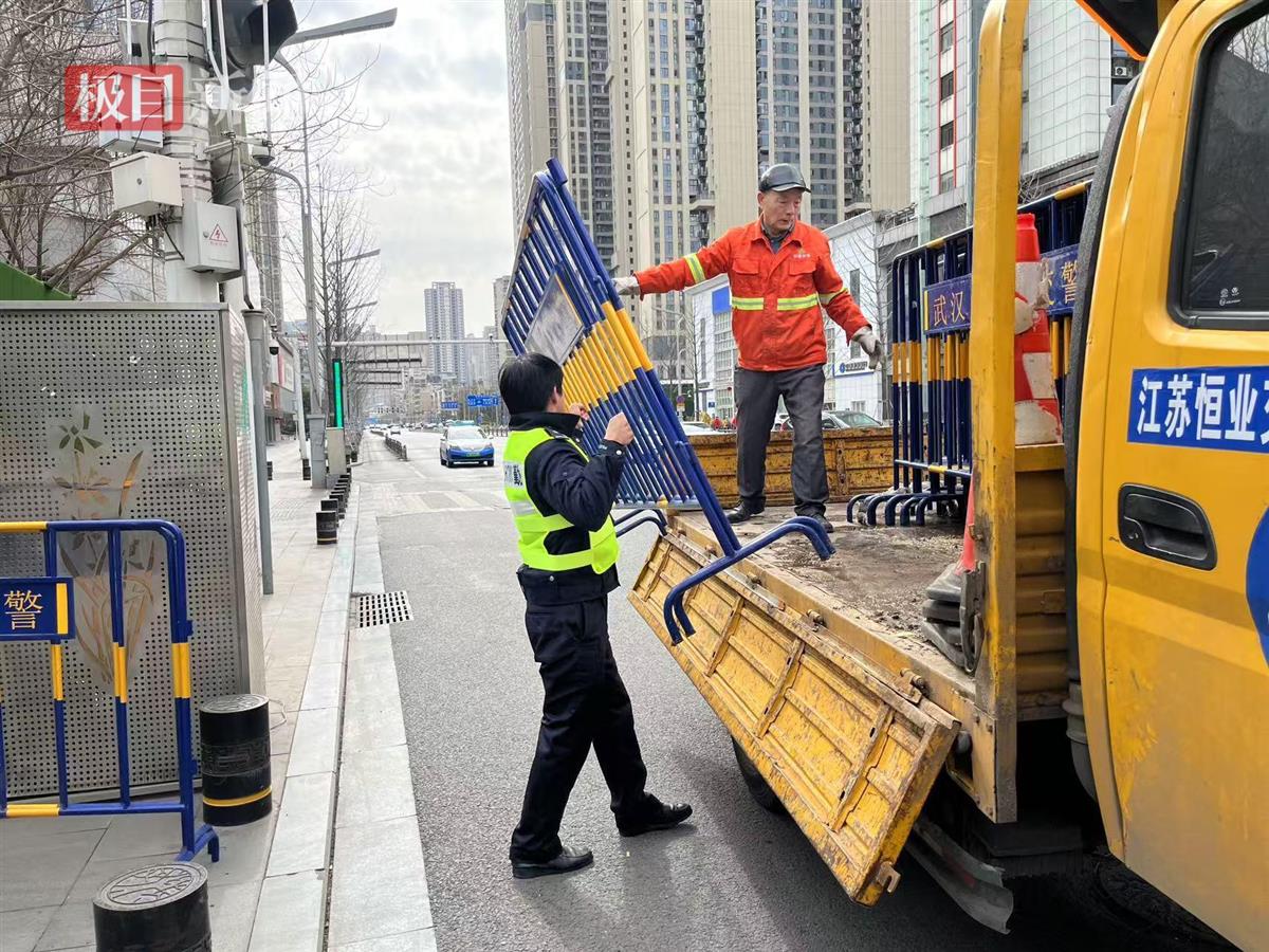 汉阳区交通大队在鹦鹉大道拦江路、翠微路,汉阳大道五琴路等路口设置禁行标牌、隔离护栏、锥形筒等交通设施,全力做好归元寺民俗文化活动交通安保工作。