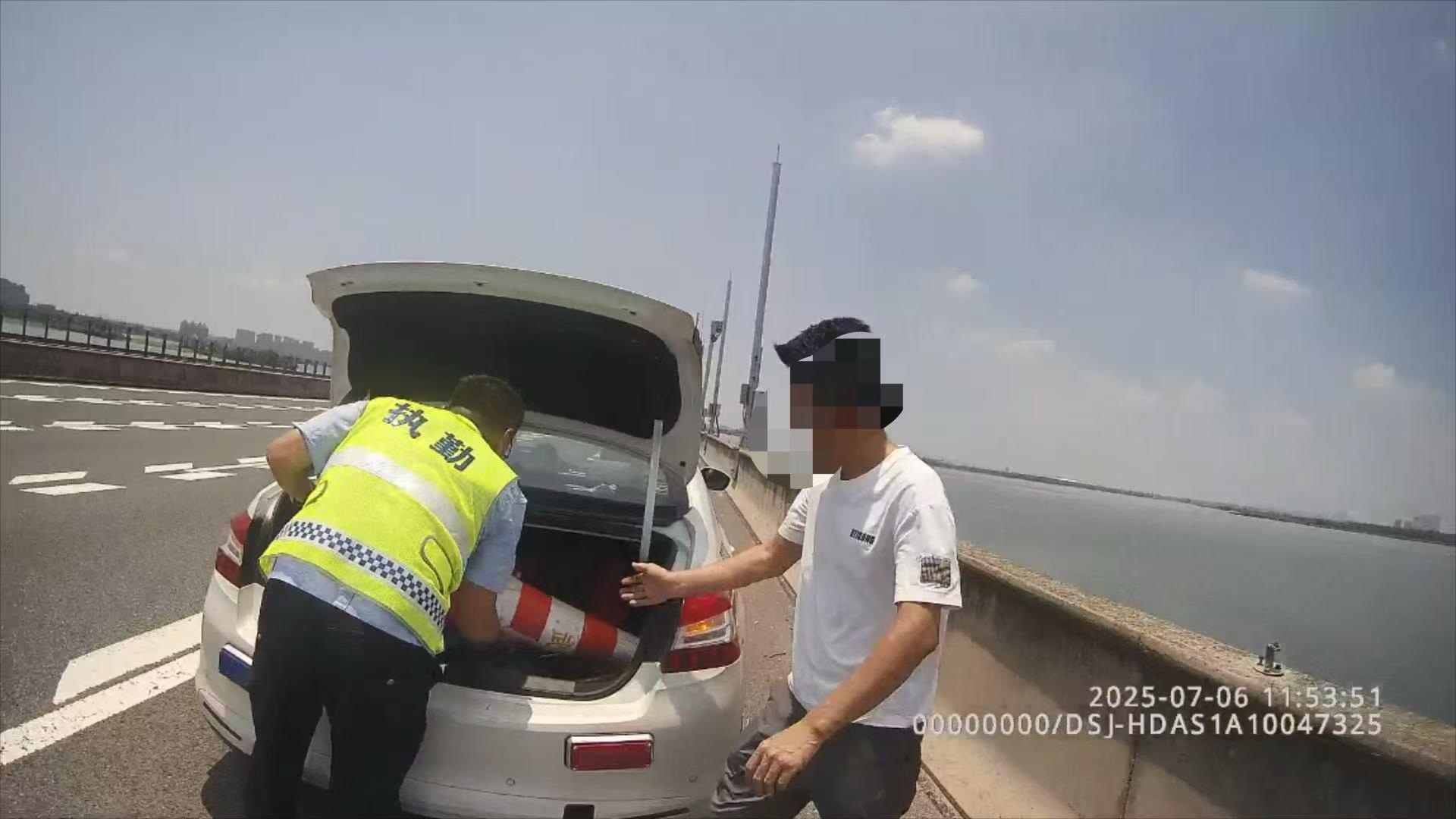 民警询问得知,鲍先生的车上没有备胎。确认人员安全后,民警吴创、辅警陶宇合力协助鲍先生将故障车辆推至应急车道,等待救援。