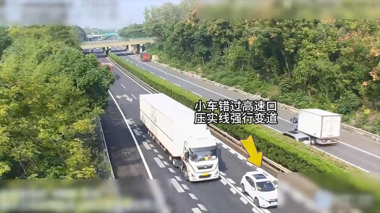 民警提供的高速公路监控视频显示:10月5日9时45分许,在武汉绕城高速下行向101公里附近江夏收费站出口匝道口,一辆大货车正在行车道内正常行驶,超车道内,一辆白色小车突然向右侧变道,压越实线减速线,从大货车车头前方急拐入江夏收费站出口匝道。大货车紧急刹车,惊险地避开了变道的白色小车。大货车随后在前方停入应急车道,货车司机报了警。