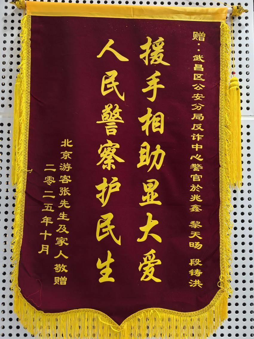 “援手相助显大爱 人民警察护民生”。10月13日,一面锦旗从北京寄到武汉市公安局武昌区分局。这面锦旗,源于游客张婆婆在武汉长江大桥上获救的经历。