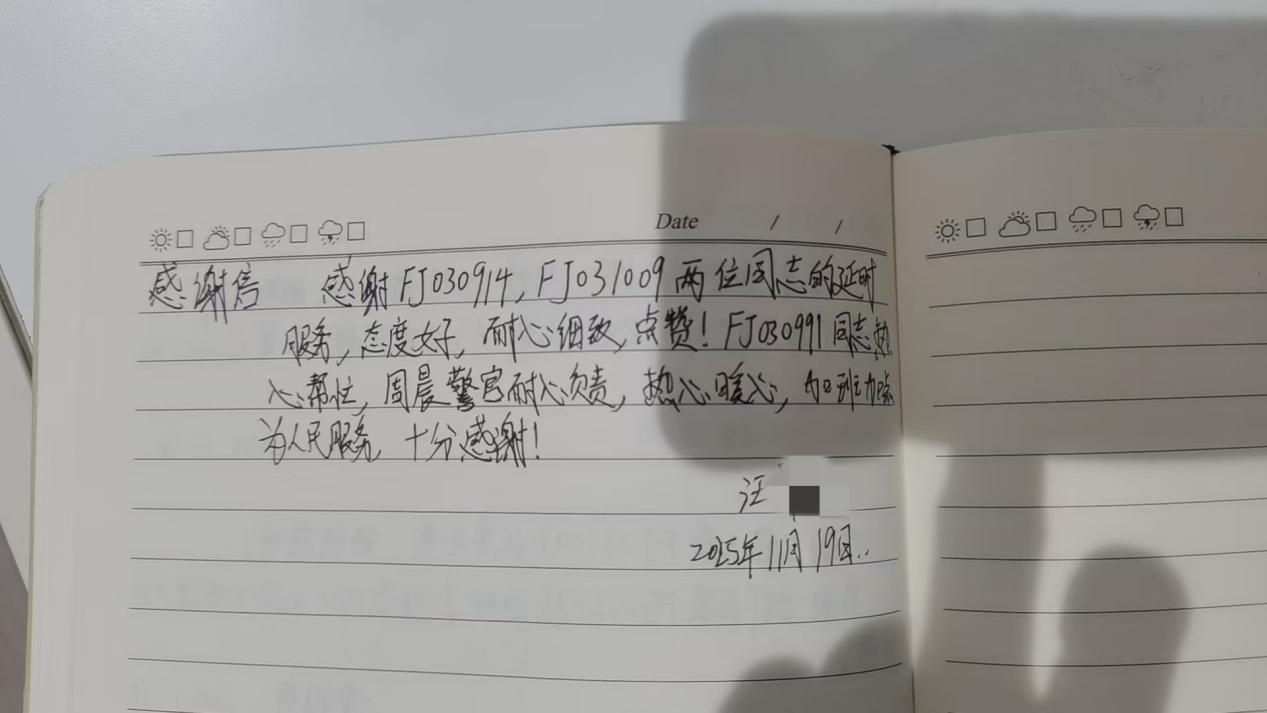 全程高效贴心的服务让汪女士倍感温暖,当场写下感谢信表达谢意。11月26日,政务服务中心收到了汪女士邮寄的锦旗,字里行间满是对工作人员“人民警察为人民、贴心耐心暖民心”的认可与感激。