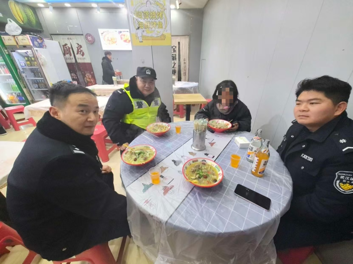 无独有偶。22时许,民警李潇、辅警陈适在瑞安街站巡逻时发现一名男乘客长时间在商业通道内滞留。陈适立即上前询问,得知乘客姓闵,前几天到武汉找工作未果,一时遇到困难。地铁站外天寒地冻,李潇为闵先生买来热气腾腾的饺子,让其吃下暖身。23时20分许,民警辅警驱车将其送往救助站安置。