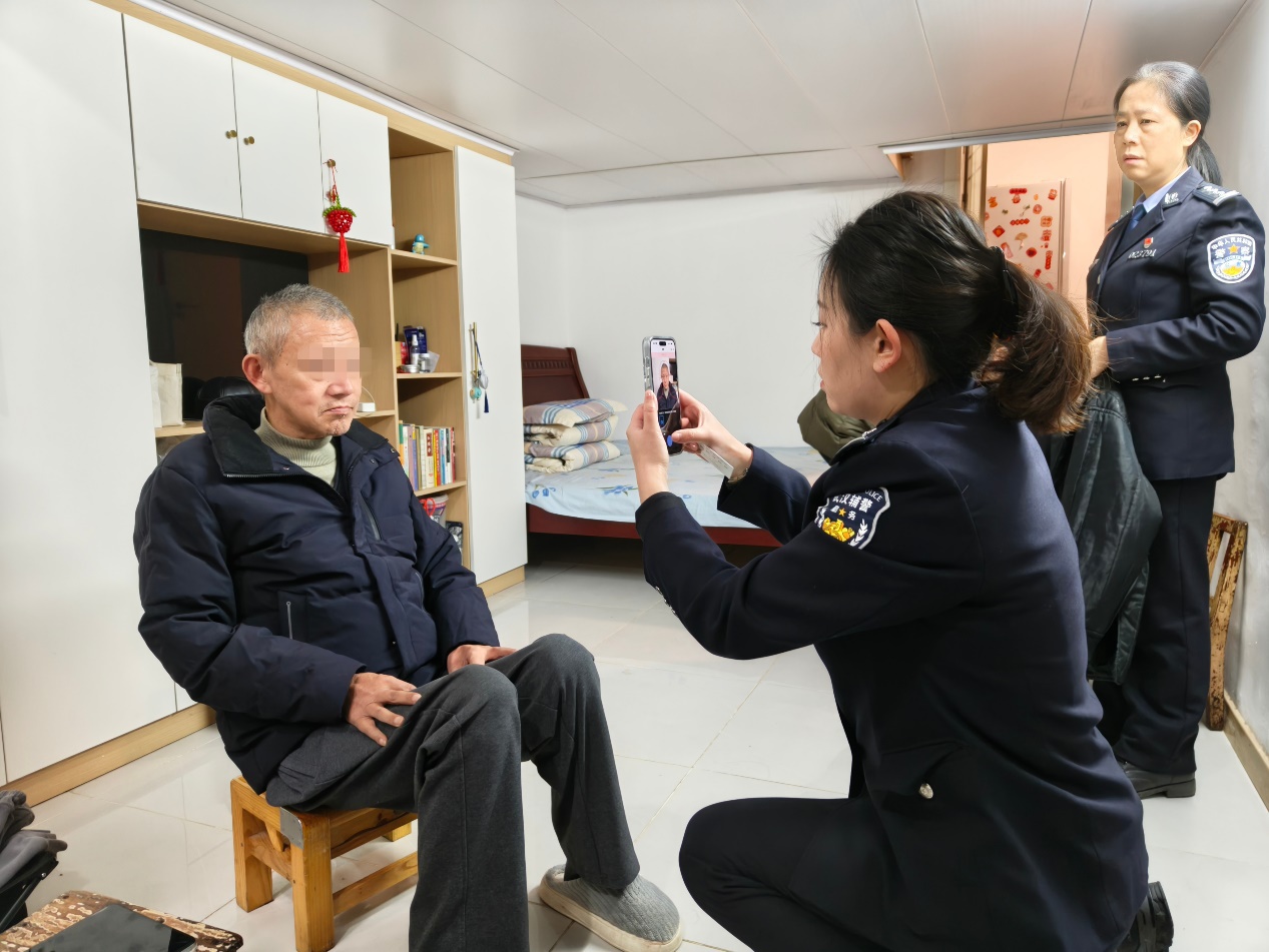 抵达明爹爹家中,队员们轻手轻脚走进屋,关切地问候他:“您好,别着急,我们扶您坐下。”民警周小红、辅警肖元璋耐心搀扶老人坐下,耐心调整坐姿,迅速调试设备,避开强光确保人像清晰。看着屏幕上清晰的照片,明爹爹拉着周小红的手念叨:“今天路上还结冰,我以为得等天暖了才能办,没想到你们直接上门,真是帮了大忙!”