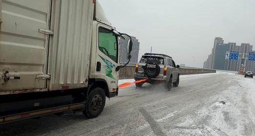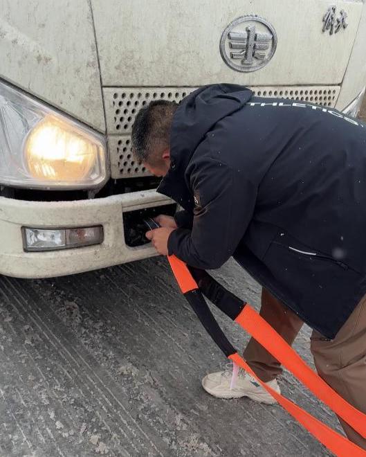 作为一名越野爱好者,詹时美的车上常年备有拖车绳等工具。担心不够用,他又从家里取出一根带上。由于大雪导致交通不畅,他花费40分钟才绕行至堵车现场。抵达后,他迅速投入救援,逐一帮助受困车辆拖车上坡。
