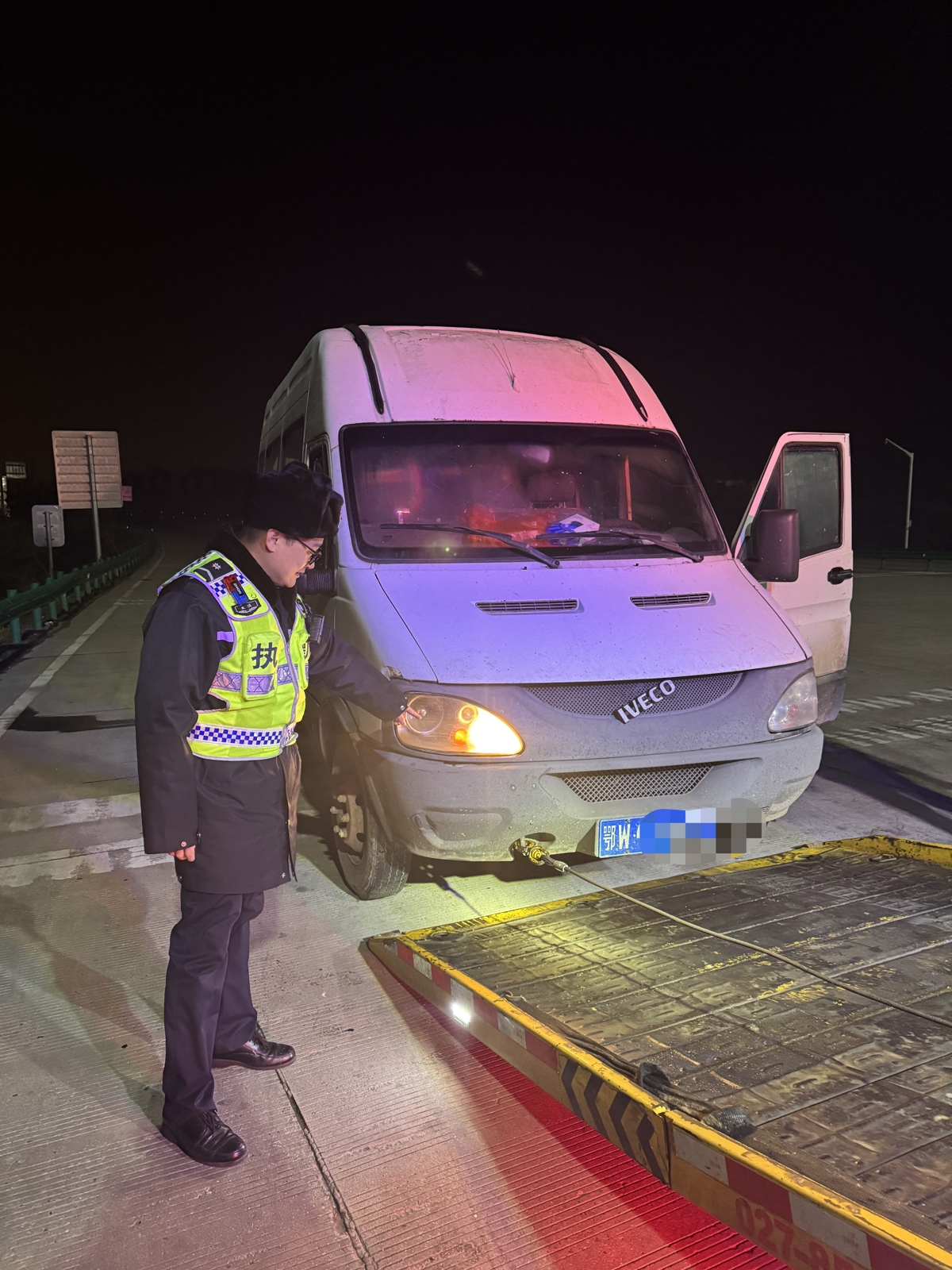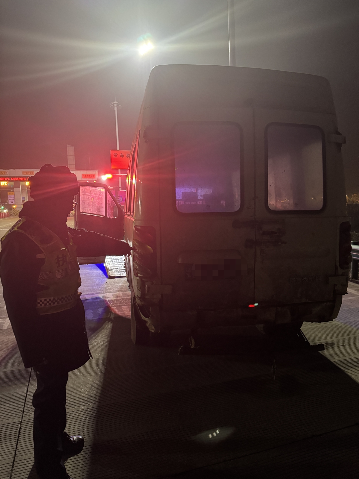 1月25日雨夜及时处置两起货车尾灯失效险情后,1月26日夜晚,武汉市公安局交通管理支队二大队继续开展夜间交通安全专项整治,民警在徐家堡收费站执勤时,再次查获一辆存在多项严重安全隐患的白色依维柯小型客车,及时消除了一起潜在的重大风险。
