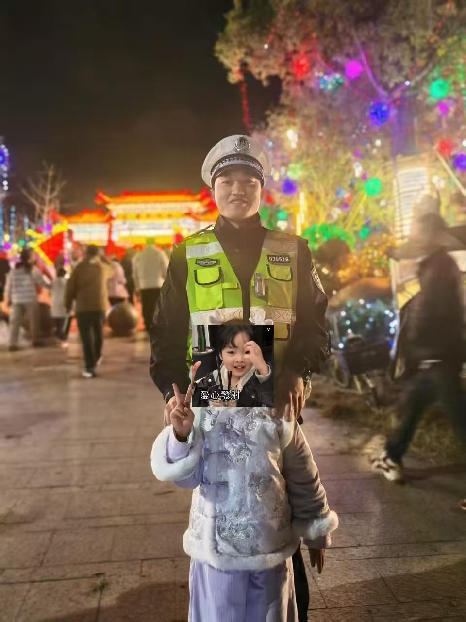 灯火璀璨处,亦是守护无声时,这张合影,是灯会夜晚的一份温暖,也是李冲从警路上的一份鼓励。
