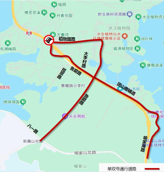 1.鲁磨路(八一路至樱花园大门)、植物园路(鲁磨路至团山路)、喻家湖路(喻家山北路至团山路)、团山路(喻家湖路至植物园路)、东湖南路(洪山路至卓刀泉北路)、卓刀泉北路(东湖南路至八一路路口)实行7座及以下载客汽车按车牌尾号分单双日通行,车牌尾号为字母的,按字母前最后一位阿拉伯数字对应日期的通行管理措施通行(巡游出租车除外)。