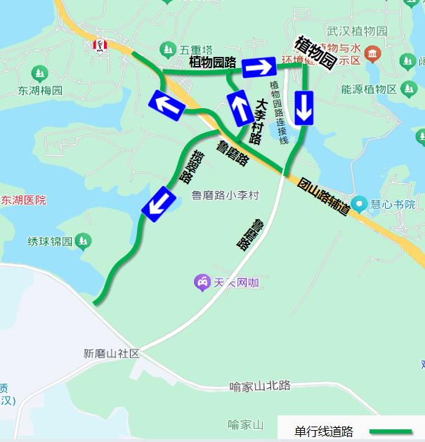 (2)植物园路(鲁磨路至团山路)只允许机动车由北向南(鲁磨路往团山路方向)单向通行。