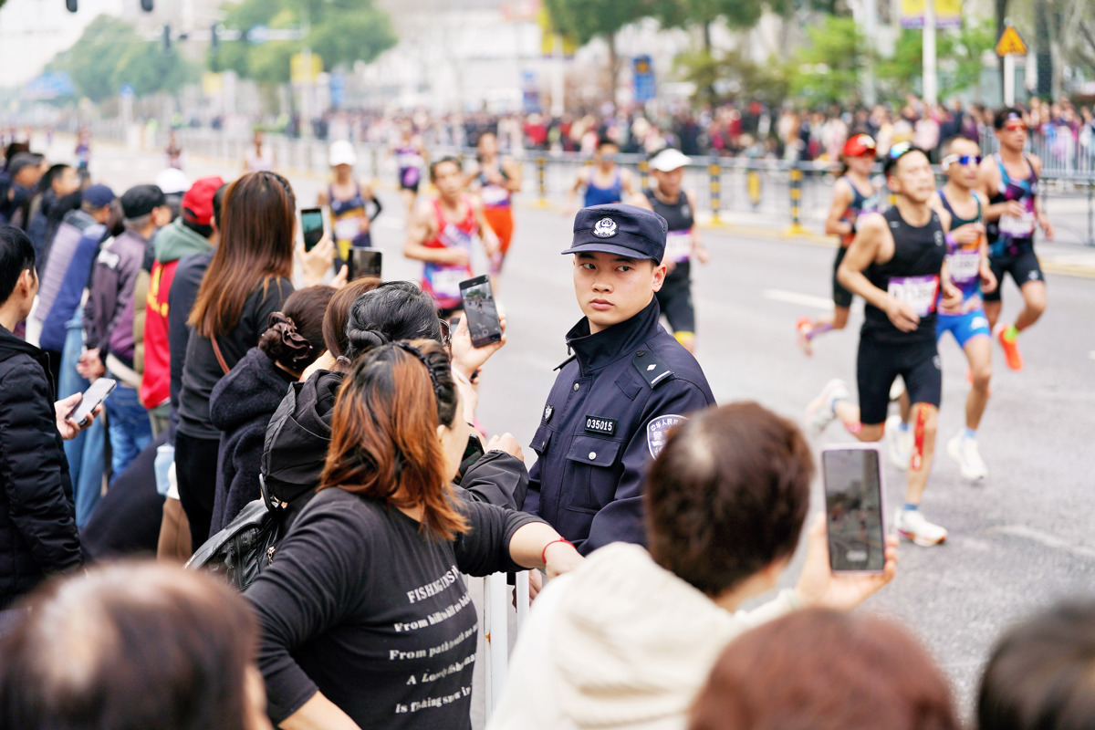 随着发令枪响的消息从起点传来,对讲机里此起彼伏的指令声让气氛骤然热烈。9时20分许,当第一梯队的选手即将进入洪山辖区时,现场执勤民警背对赛道、面向观众,筑起了一道藏蓝防线。