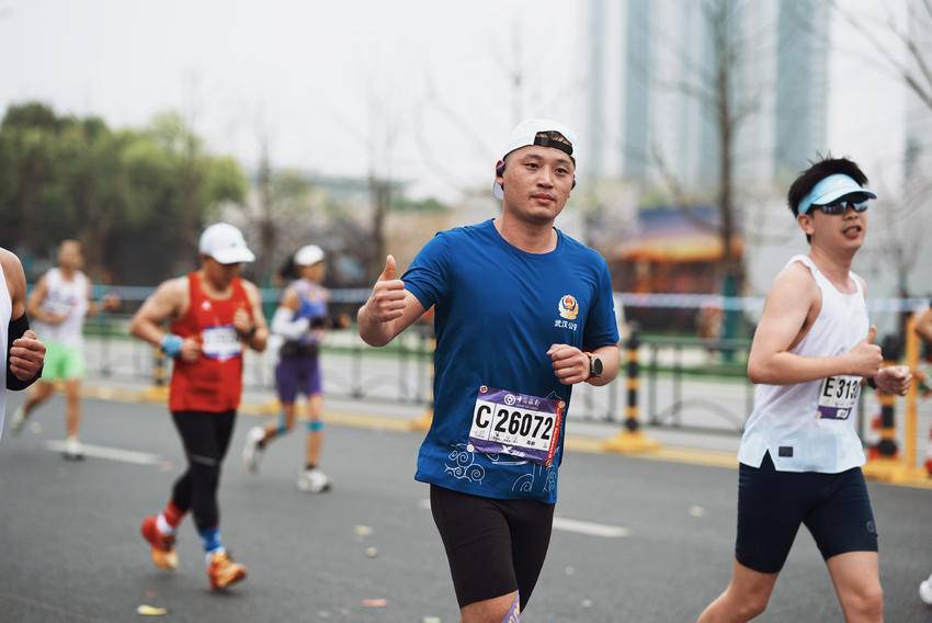 在3万名跑者中,有一群身着蓝色“武汉公安护跑”运动服的特殊选手格外引人注目。他们是武汉公安护跑团成员,既是参赛者,也是赛道上的“流动安全员”。