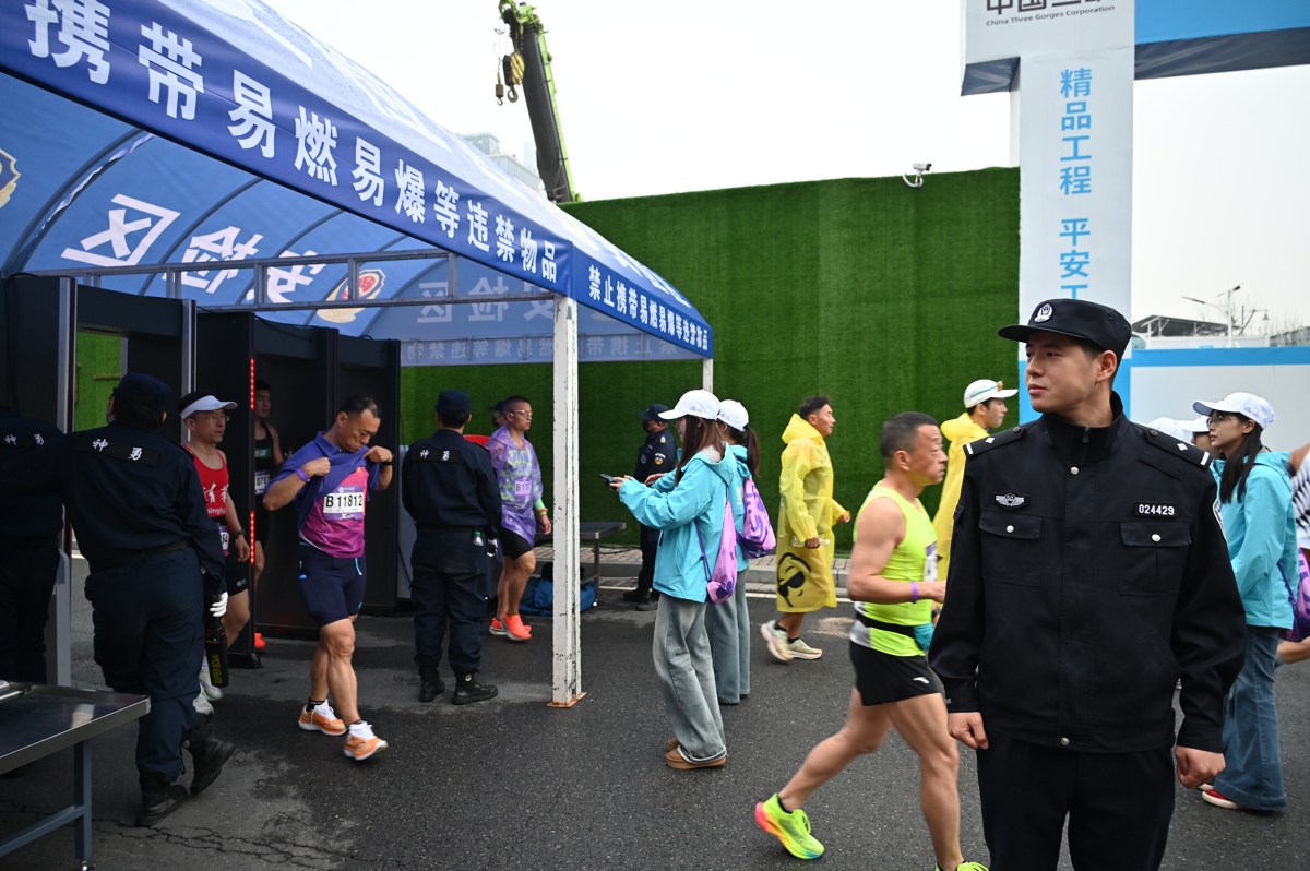 在运动员集结区,民警同样紧张而有序地忙碌着。这里是选手们奔赴赛道的“第一关”,他们用清晰的指引和温暖的守护,确保数万名跑者能够高效、安全地完成赛前准备。