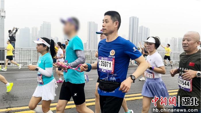 长江大桥上,一名从广州专程来汉参赛的女士因路滑摔倒,护跑团成员、出入境管理支队民警安嶷峰立刻上前搀扶,将她送至路边医疗救助点。短暂休息后,安嶷峰担心她后续再出意外,便陪着她跑完了最后10公里。