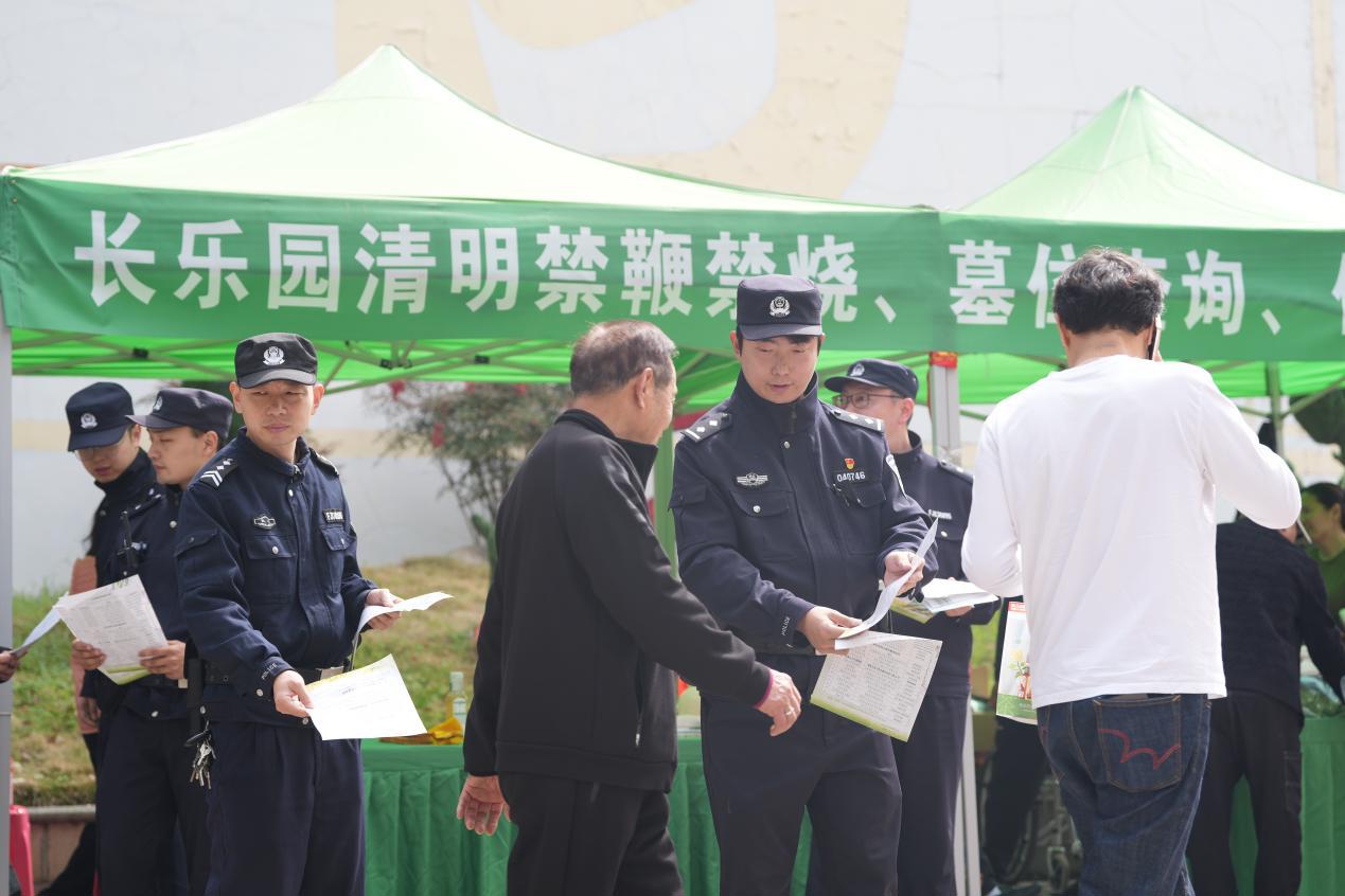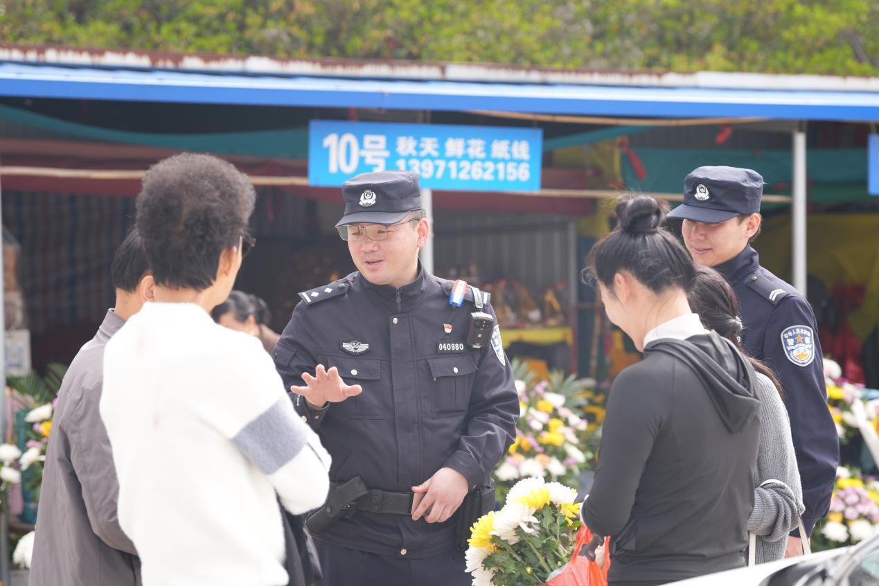 在黄陂区长乐园陵园,黄陂区分局交管大队与前川派出所联勤联动,全力开展周边交通疏导。执勤期间,陵园入口处两家商户因鲜花纸钱销售问题发生口角争执。前川派出所民警徐亮迅速上前制止,将双方分开后,通过讲事实、摆道理、释法律等方式开展耐心调解,最终促成双方相互谅解,及时化解矛盾纠纷。同时,黄陂区分局环食药侦大队联合派出所警力在陵园内开展森林防火宣传,引导群众在指定区域规范焚烧祭祀物品,筑牢祭扫安全防线。