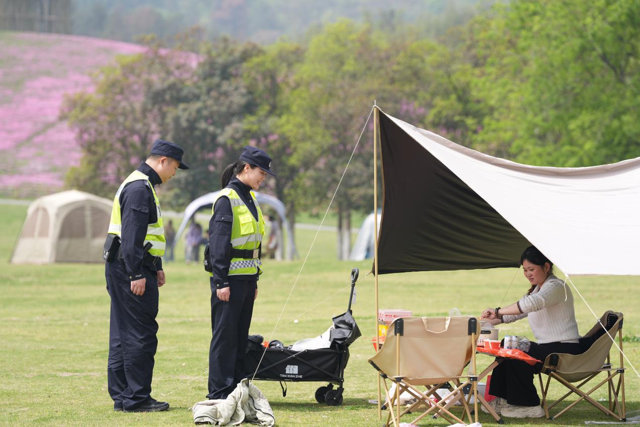 “请问你们是在这里露营吗?有没有使用明火?一定要注意用火安全。”在黄陂区木兰草原景区,黄陂区分局王家河街派出所民警李文笛带队开展巡逻防控。每到一处露营点,民警都细致提醒游客当前枯草较多,严禁违规使用明火,离开时务必彻底熄灭火源。当天,李文笛与巡逻队员徒步巡逻两万余步,开展安全检查,处置群众求助,帮助游客寻找遗失物品、找回走失儿童,以细致服务守护景区平安,获得游客一致好评。