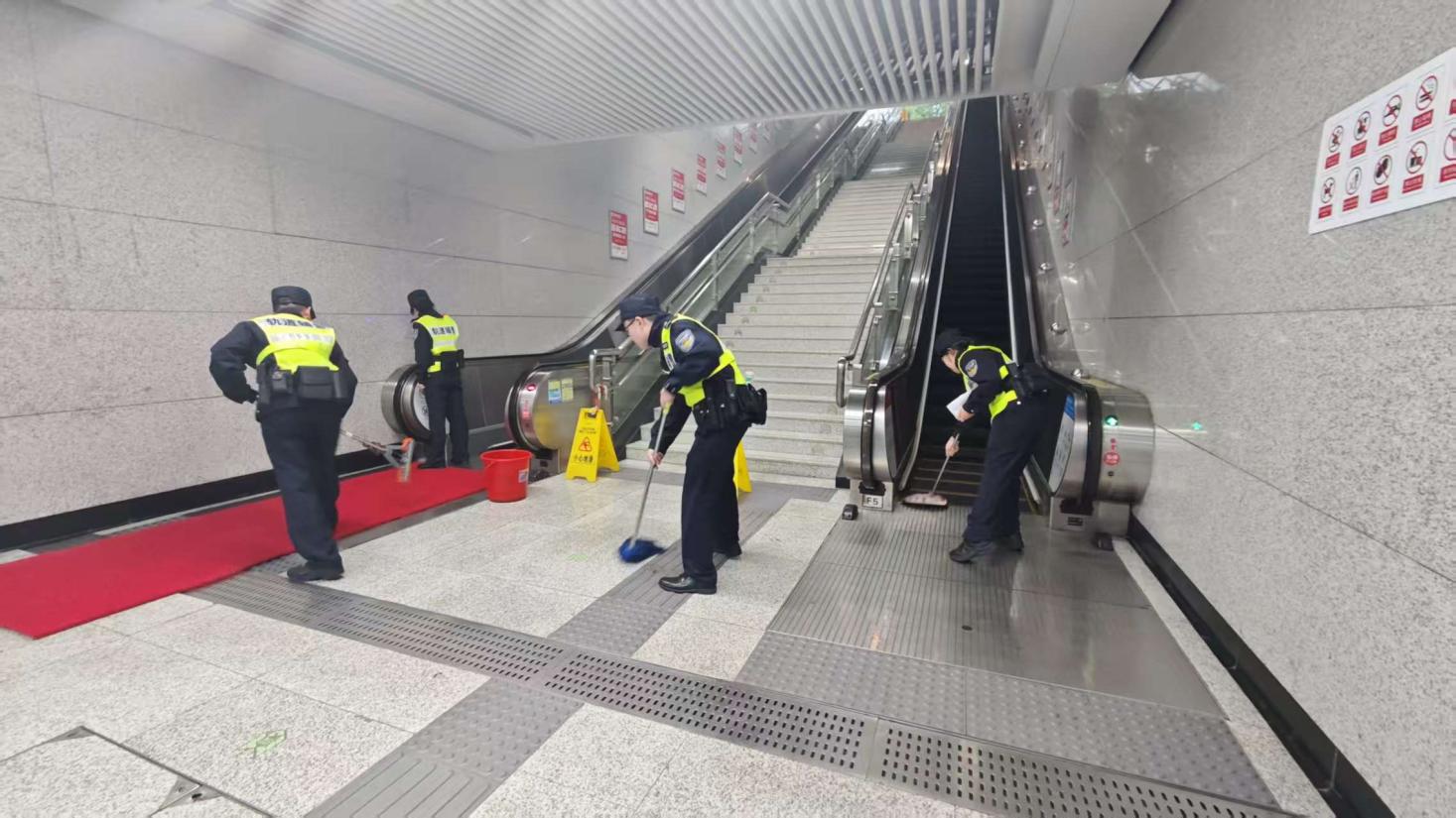 为有效应对暴雨天气,武汉轨道公安在全网重点车站叠加投入警力,加强巡查巡检,持续强化客流疏导、秩序维护和服务乘客等工作。充分发挥“江城义警——平安地铁联盟”作用,组织民辅警、站务员、护卫等力量对高架站顶棚、换乘通道、地铁出入口、陡峭扶梯等重点部位开展安全检查,及时发现并处置各类风险隐患。在楼梯、进出站通道等重点部位布置人员,摆放各类防护设施,提醒过路乘客注意防滑、防摔,保证乘客出行安心放心。