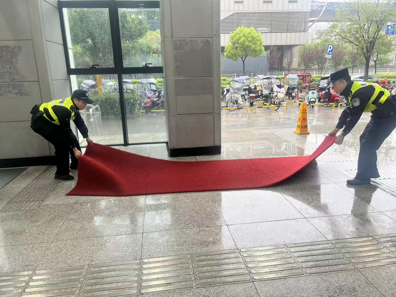 10时许,受大雨影响,地铁16号线湾湖站出入口地面变得湿滑。人群中,辅警田小龙正带领地铁工作人员在出入口铺设防滑垫,看到有乘客准备进站乘车,他还大声提醒道:“下雨天脚下湿滑,大家上下楼梯注意安全,以免摔倒受伤!”