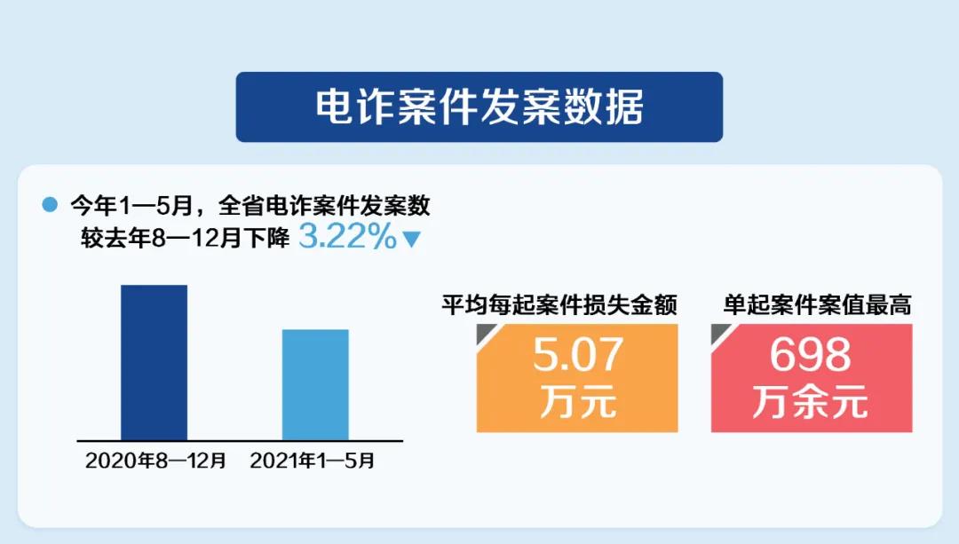 湖北省反诈中心数据显示,今年1至5月,全省电诈案件发案数环比去年8至12月下降3.22%,占总刑事警情数的27.10%。平均每起案件损失金额5.07万元。其中,单起案件案值最高达698万余元。