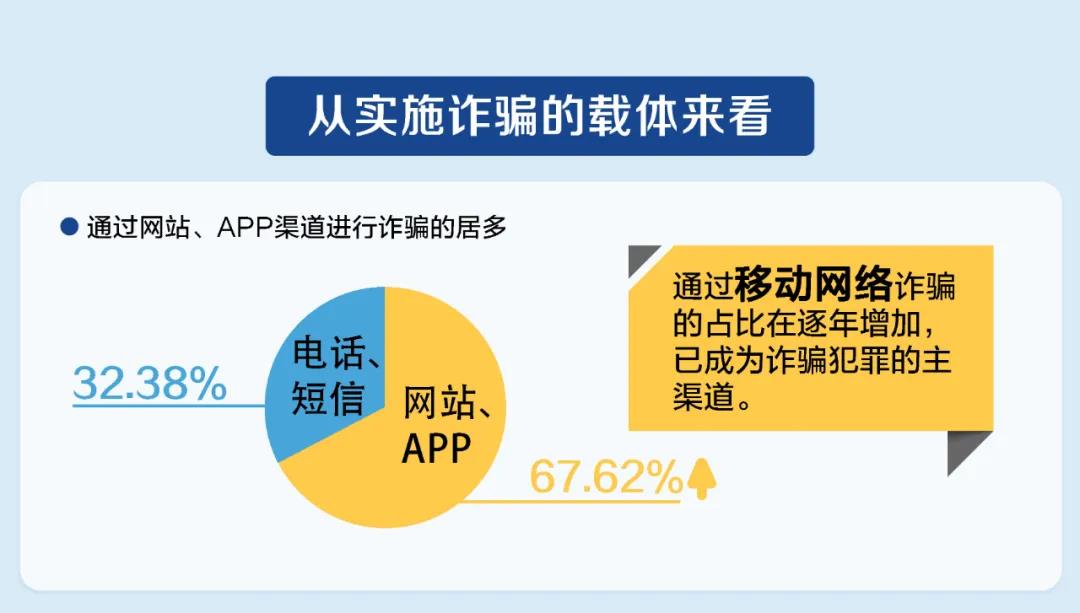 从实施诈骗的载体来看,通过网站、APP进行诈骗的占67.62%,通过电话、短信诈骗的占32.38%,通过移动网络实施诈骗的占比呈逐年增加趋势,已成为电信网络诈骗犯罪的主渠道。从诈骗案件类别来看,我省电诈案件中占比最高的,分别是刷单返利类、杀猪盘类、网络贷款类、冒充电商物流客服类、冒充公检法及政府机关类诈骗,分别占比23.66%、21.24%、16.36%、10.42%、4.67%。