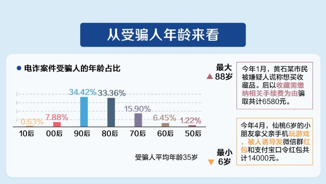 根据湖北省反诈中心相关数据显示,目前我省电诈案件受骗人10后占比0.63%;00后占比7.88%;90后占比34.42%;80后占比33.36%;70后占比15.90%;60后占比6.45%;50后占比1.22%。受骗人平均年龄35岁。其中,年龄最大的受骗人88岁。今年1月,黄石某市民接到诈骗分子电话,称想购买其家里的收藏品,随后以收藏需要缴纳相关手续费为由,骗取6580元。年龄最小的受骗人仅6岁。今年4月,仙桃一名小朋友拿父亲手机玩游戏时,被人诱导用手机发送红包,被骗14000元。