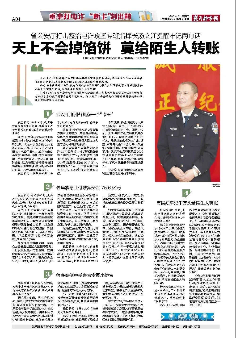 记者:电诈要严打,更要严防,不发案、少发案才是最大的民生。在预防电诈方面,我省警方是如何开展工作的?汤文江:打击电诈,“防”是首位。为此,我们建立了一套全流程防范体系。比如,首先是事前系统拦防诈骗电话打入。警方联合通管局开展省际端口拦截,对发现外省诈骗电话全面阻断,形成全省防诈“金钟罩”。去年9月以来,共拦截涉诈电话936万余次、短信61.1万条。其次是事中提醒劝阻,防群众当受骗。通过大数据等信息,一旦发现受害人可能受骗,就提前预警。攻坚行动以来,共预警劝阻群众132万人次,避免损失近3亿元。比如:——今年1月20日,江汉油田公安局成立反诈预警中心,根据群众被骗的可能性和紧急程度,综合运用96110电话劝阻和派出所、社区上门劝阻。今年1月至3月,该中心劝阻潜在受骗资金341.7万元。以前只能追在骗子屁股后面跑,非常被动。有了预警系统,可以从源头上减少发案,降低了群众财产损失。最后就是全面广泛宣传,针对重点部位、重点时段、重点人群开展精准宣传。骗子一旦置身于人民群众宣传、举报的汪洋大海,便难以藏身。记者:打击电诈,我省警方确实想了很多招。事实上,受害群众不仅关心警方破了多少案件、抓了多少人,而且更关心他们的钱被骗后,警察追不追得回来?汤文江:确实如此。其实,我省警方在严打电诈的同时,一直把降低群众损失作为重要工作目标。如果发现群众还是上当受骗了,警方就会立即跟进,采取事后紧急止付,防被骗资金转走。目前,我省建立96110三方通话,组建专门团队,提升接警止付效率。我们依托止付平台,联合入驻银行坐席,争分夺秒与犯罪分子赛跑,强力止付拦截资金。通过资金追踪,2020年共紧急止付涉案资金75.6亿元,冻结涉案资金25.8亿元。今年一季度共止付账户9.6万个,止付资金56.4亿元,冻结账户1.6万个,冻结资金11.3亿元,最大程度地帮群众挽回损失。